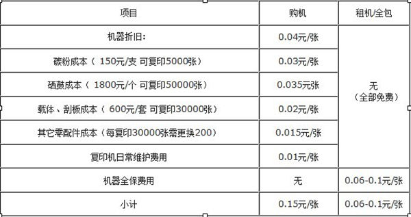下面 我们以一台中等速度普通型复印机为例,其寿命张数大约为50万张左右,市面售价约为20000元来计算其单张成本。