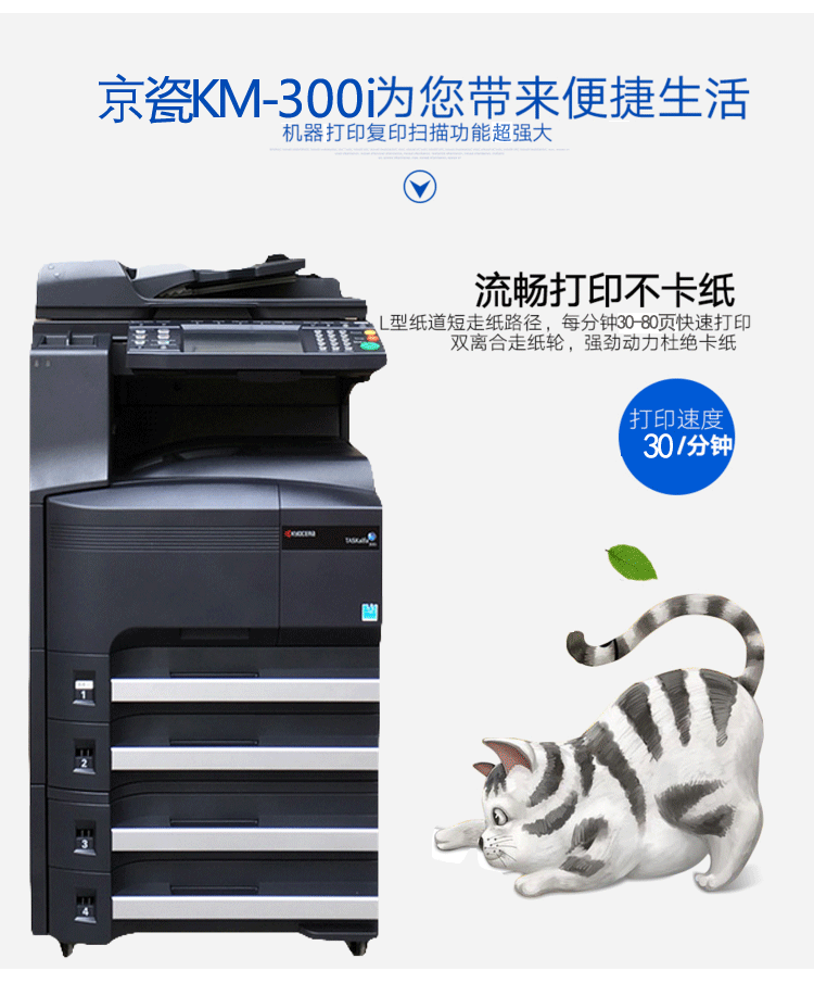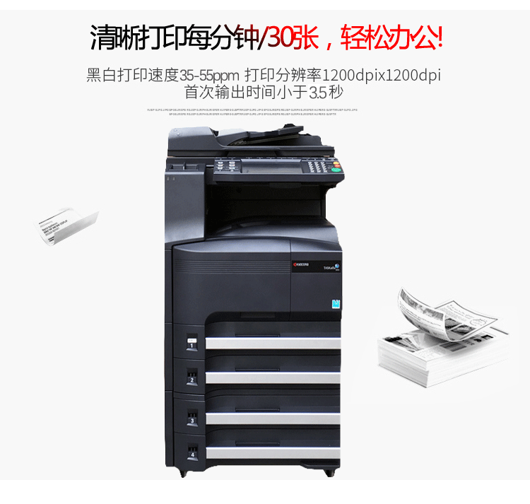 机型参数:功能:黑白/复印/打印/扫描;速度:中速30页/分钟;内存:2G内存/160G硬盘;纸张尺寸:A3-A6;打印方式:有线/USB/自动双面;其他:2个纸盒。