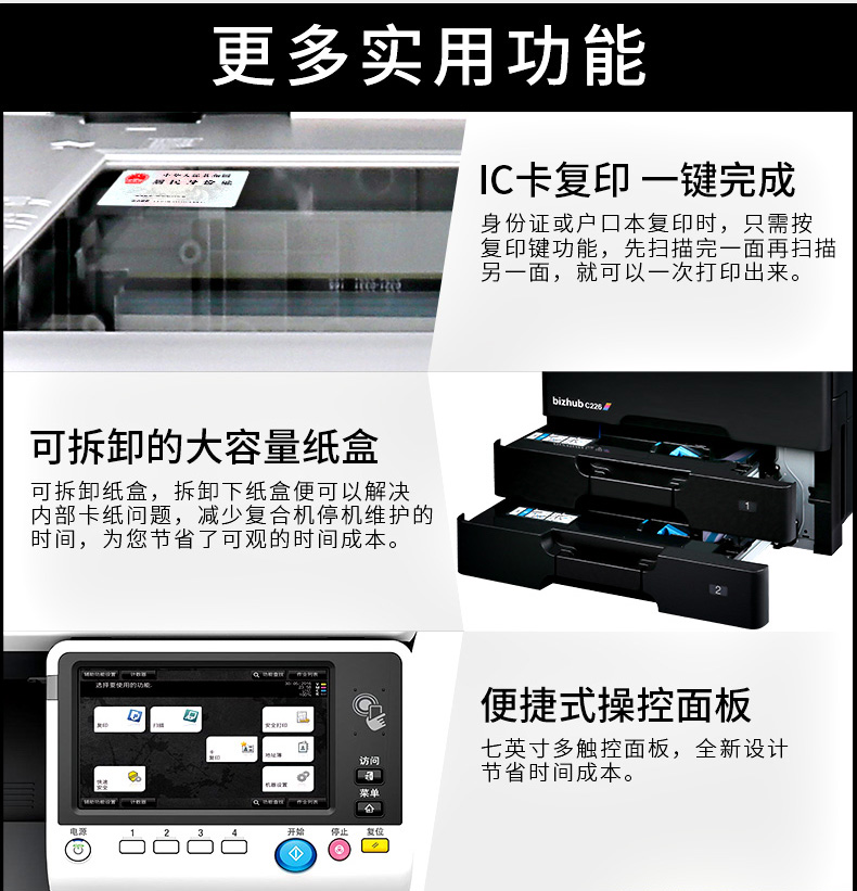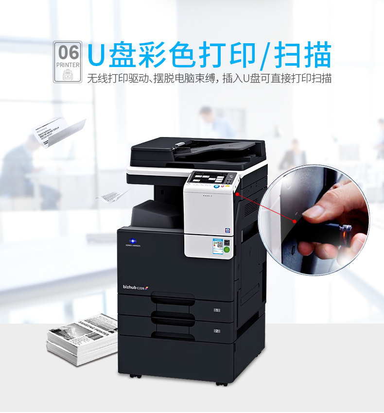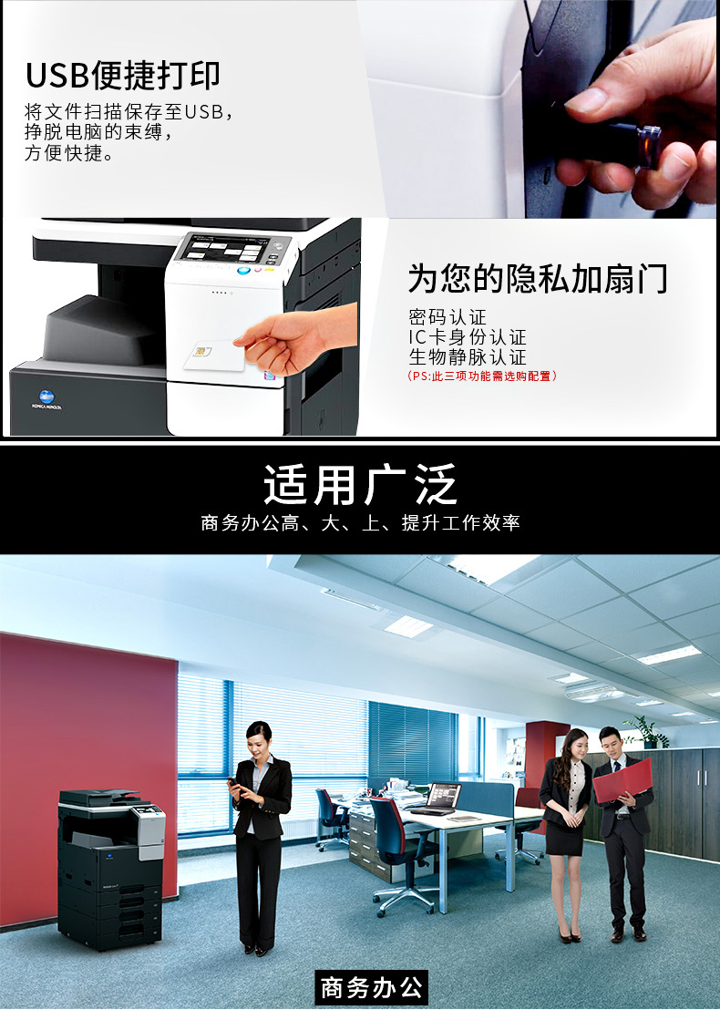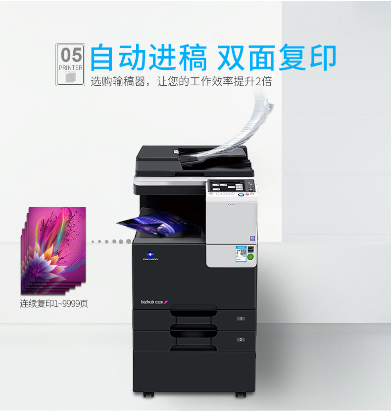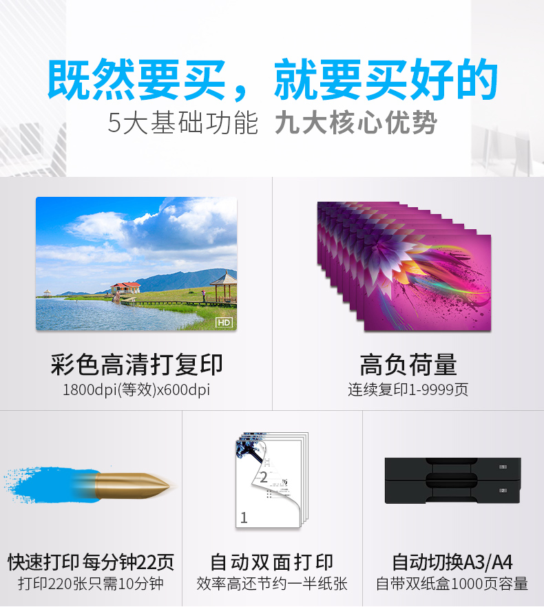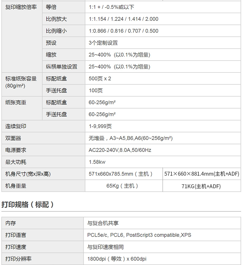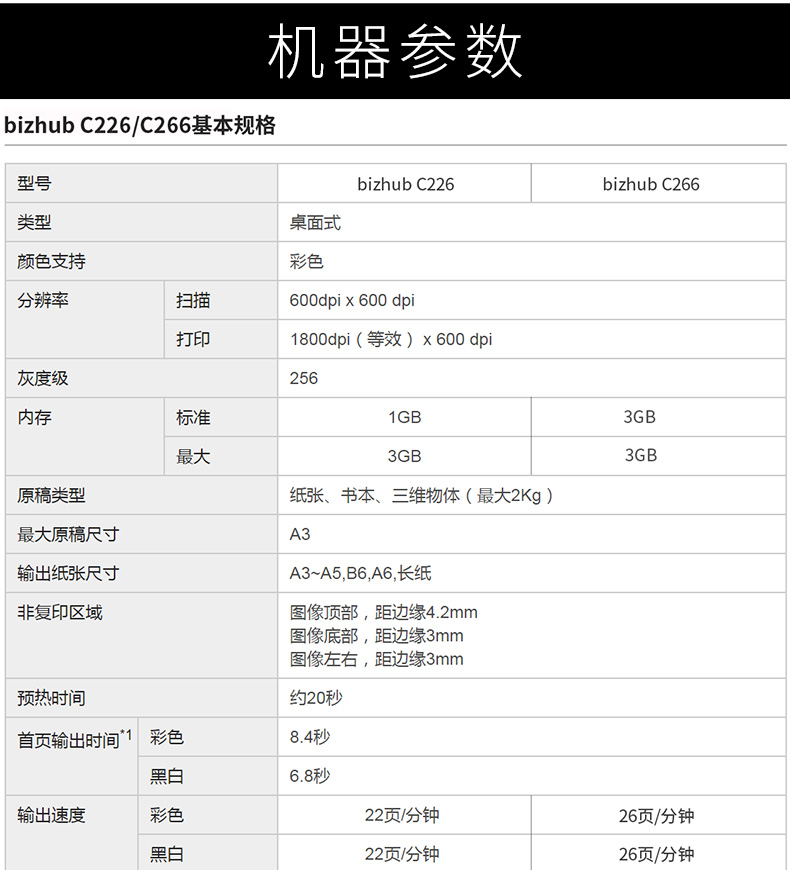 机型参数:功能:彩色/黑白/复印/打印/扫描;速度:中低速22页/分钟;内存:1GB;纸张尺寸:A3-A6;打印方式:有线/USB/自动双面;其他:双纸盒。