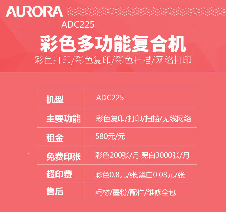 【主要功能】彩色复印/网络打印/扫描【租金】580元/月【免费印张】彩色200张/月,黑白3000张/月 【超印费】彩色0.8元/张,黑白0.08元/张【付款方式】租金月付,先用后付,超印费半年一结【合同期】三年起租【押金】5000元/台【售后】维修呼叫全市4小时上门,尽量做到随叫随到。
